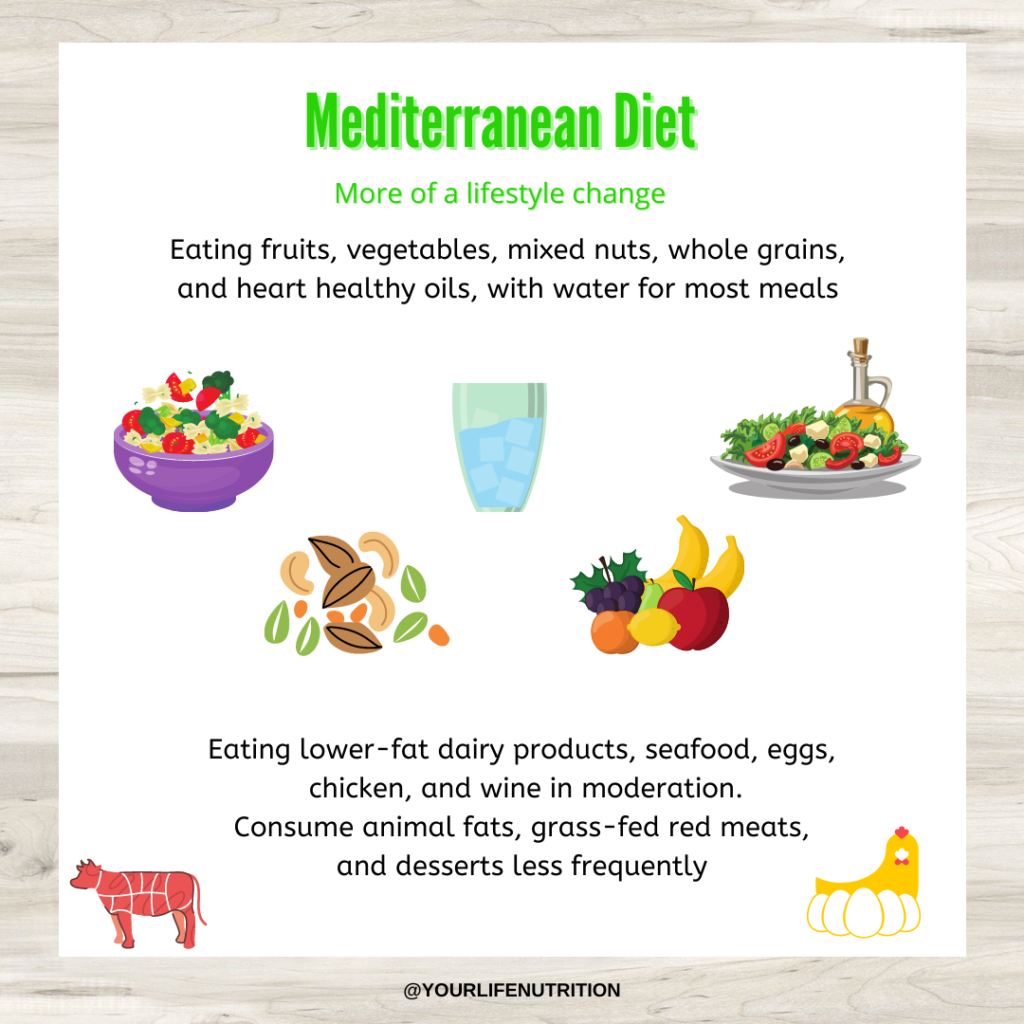 The other heart healthy diet is the Mediterranean diet and is the most recommended diet to improve heart health. This is actually not exactly a “diet” but more of a lifestyle change, which we love as RDs. Food wise, the Mediterranean diet encourages foods in frequencies. Every meal be based on the consumption of fruits, vegetables, whole grains, heart healthy oils, beans, nuts, legumes, seeds, and herbs and spices (3). Foods encouraged often are fish and seafood, while poultry, eggs, cheeses, and yogurt are recommended moderately (3). Red meats and sweets are recommended in limited frequencies (3). For beverages, water is the main drink in this diet, but red wine is alright in moderation (one 4oz glass for women, up to two 4oz glasses for men) (3). By choosing more plant-based options, you’ll be taking steps to improve cholesterol levels, just like the DASH diet.