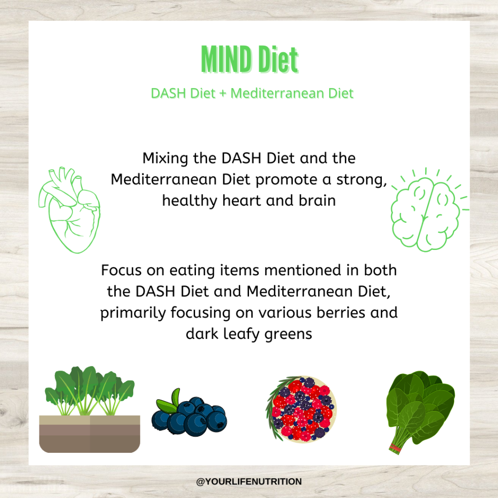 Interestingly, there is a hybrid of both these diets known as the MIND diet. Given the name MIND, this diet focuses on improving brain health, but also has characteristics to improve heart health as well. This diet emphasizes a plant-based, limited processed style of eating, primarily focusing on berry and leafy green vegetable consumption (4). This diet also encourages limited amounts of animal products, such as milk or butter, and fried foods (4). Studies have suggested that foods in the MIND diet are shown to be protective against developing cognitive diseases, such as Alzheimer’s Disease (4). The Mediterranean diet and DASH diet also encourage items that are protective to your brain, but the MIND diet is the more optimal choice, while also protecting your heart.