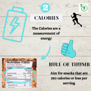 The next important item listed on a label is the calories. A calorie is a measurement of energy. Our bodies need a certain amount of energy to perform important functions like breathing, brain function, and skeletal movement. A good rule of thumb is to look for a snack with 250 calories or less per serving.