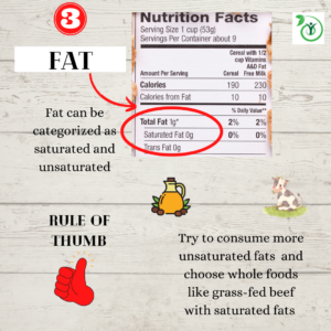Following calories, we want to look at the amount of fat a food contains. There are different types of fat including saturated/trans-fat and unsaturated fats. The saturated or trans-fats contribute to increased cholesterol and eventually may cause heart complications. Unsaturated fats include mono & polyunsaturated which are your heart healthy fats and may improve your cholesterol or provide other benefits like reduced inflammation.