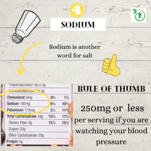 Next, look at the sodium. Sodium is simply another word for salt which our bodies need for nerve and muscle function as well as fluid balance. However, according to the Food and Drug Administration, our bodies only need about 1 tsp. per day to perform these functions. Too much sodium can increase risk for heart complications, so it is recommended to look for foods with 250 mg or less per serving.
