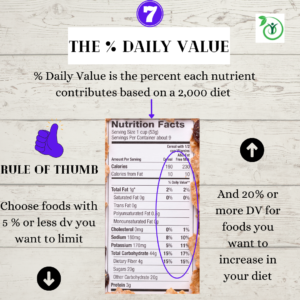 Finally, look at the bottom of the label for the % Daily Value. This is a measurement of the percent contributed to a general 2,000 calorie diet. The American Diabetes Association recommends aiming for 5% or less of foods you want to limit like sodium and saturated fats and 20% or higher for foods with nutrients you want more of including fiber, vitamin D, calcium, or iron.