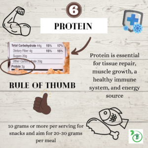 Next, look at the protein. This is a key macronutrient that our bodies need for functions like tissue repair and muscle growth, a healthy immune system, and providing energy. Aim for 5 grams or more per serving to help satisfy hunger. Good sources include lean meats, cheese, dairy, nuts, and beans.