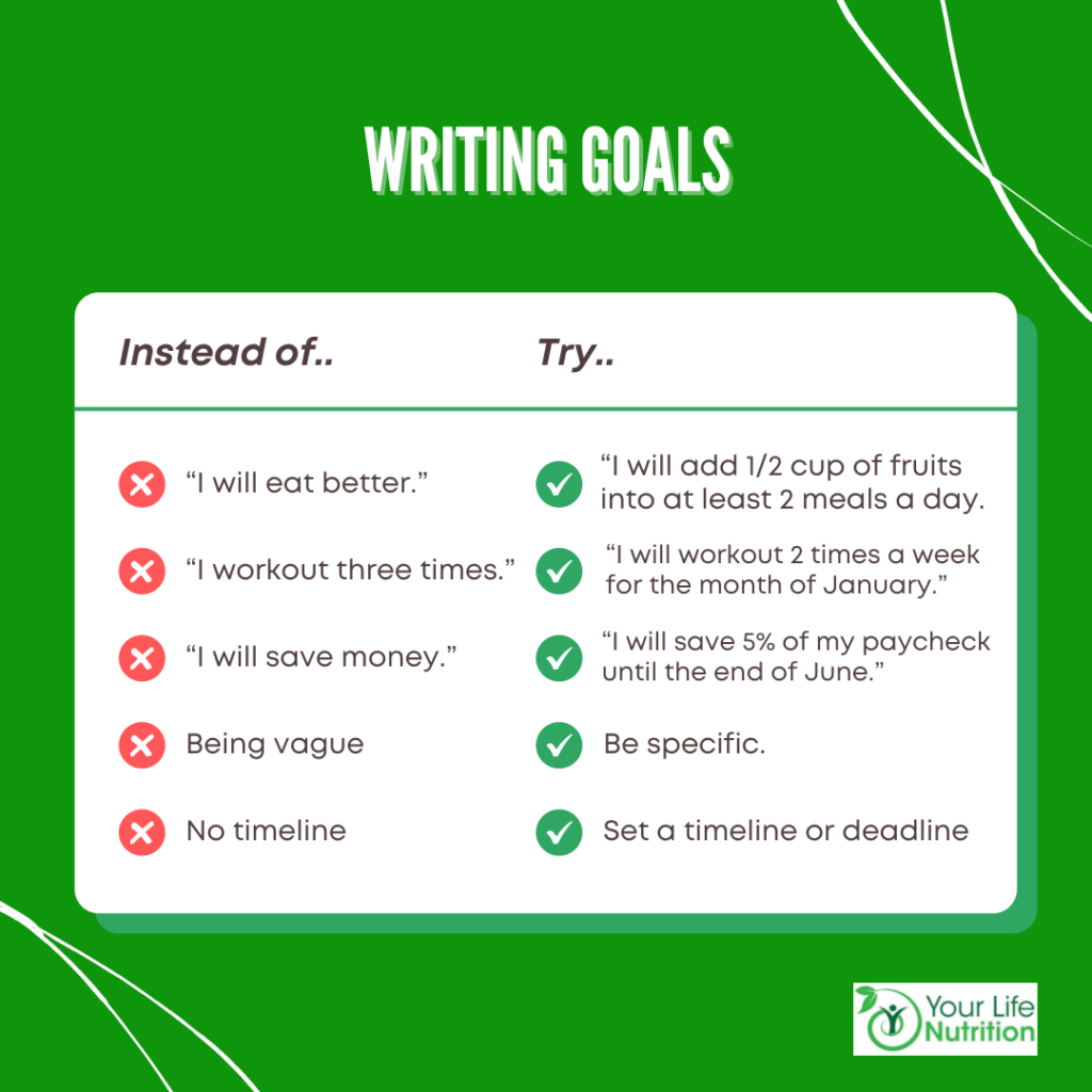 It can be difficult to write a goal that is attainable and achievable when we have our minds so set on the end goal. Going back to our first example, if someone says that they want to lose weight, it might be better to write goals for 5 or 10 pound increments over shorter periods of time. This way, the goal is easier to digest and complete. Being realistic with goals also plays into this. Sometimes our progress is not as linear as we expect it to be. Most of the time there might be points where we plateau. Eating and exercise habits change as life changes. It would be unrealistic to expect them to be able to lose that much weight in a short amount of time. Plus, large weight changes in a small amount of time can have negative effects on the body and mind. It is important to consider all aspects of your health when writing your goals. When you set smaller goals that are realistic and easier to hit, it allows the motivation to continue and can create a feeling of accomplishment.