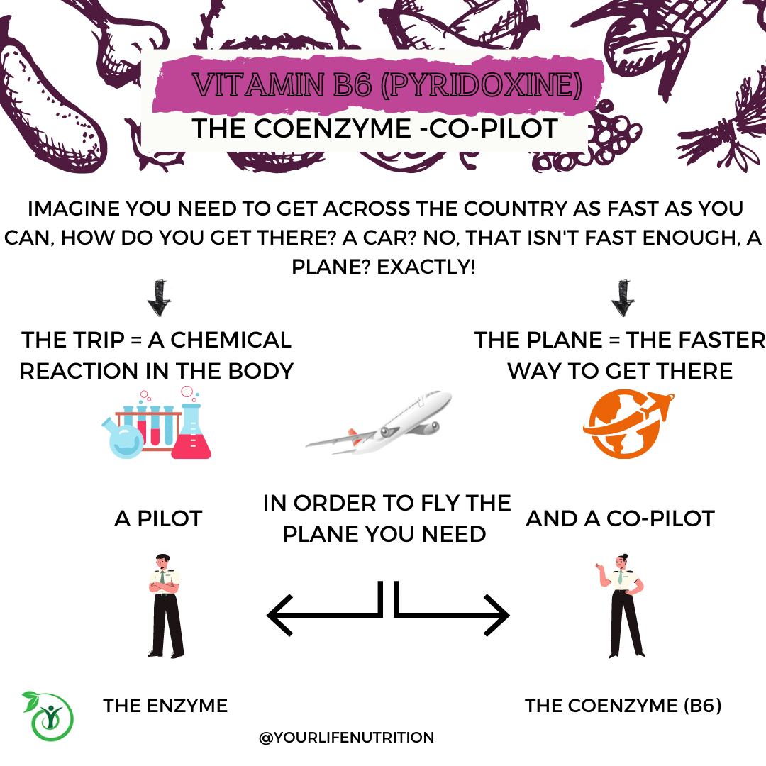 The same is true for chemical reactions in the body. If you took a car to travel across the country, it would take a lot longer than if you took a plane. But, unless you have your pilot license, you may need the help of a pilot when flying the plane. The same is true for the chemical reactions in the body. They cannot get to their “destination” or finish these chemical reactions on time, they need some assistance. So, who is this helper? Enzymes! You can think about enzymes as the fastest way of traveling. The enzymes are kind of like the pilot needed to fly the plane to get you to your destination on time. If you remember, a pilot also needs a co-pilot to help fly the plane. For our bodies, the co-pilot is a coenzyme, most often a vitamin.3