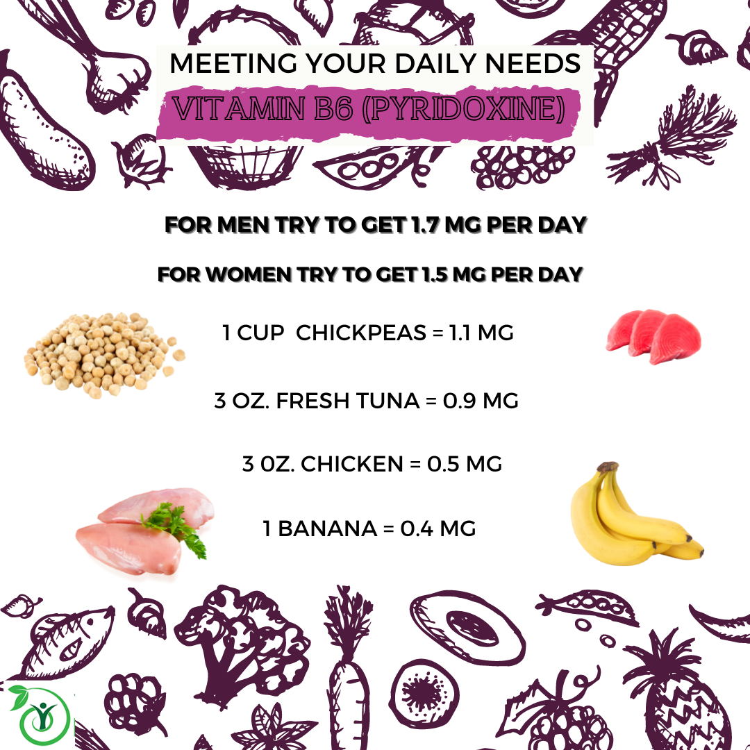 Vitamin B6 deficiency is uncommon, but it is still important to be aware of the signs and symptoms of B6 deficiency as this leads to microcytic anemia.3 It can take months or years to start developing symptoms like scaling of the lips/cracks at the corner of the mouth, swollen tongue, depression and confusion, irritability, and abnormally acute hearing.3 This is why it is so important to be aware of how much B6 you are consuming per day naturally from foods. Vitamin B6 likes to keep important functions in the body moving and staying “on schedule”, so next time you find yourself running late to an event, just remember B6 and other enzymes are hard at work keeping you “on time” everyday!