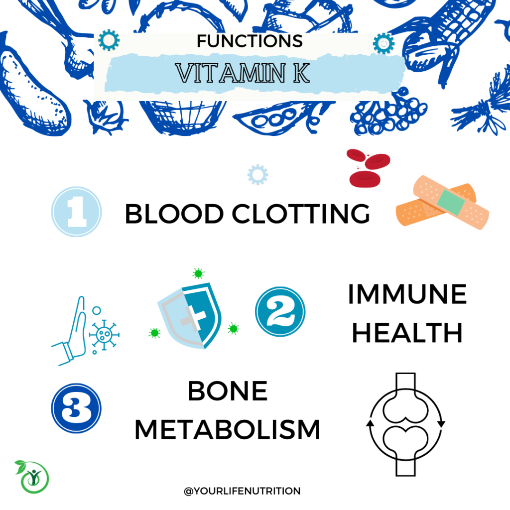 The functions of vitamin K include making various proteins, building bones, and regulating calcium.2 Now, if there is one thing we know, it’s that there are tons of different proteins the body makes for all sorts of different functions. Vitamin K specifically works in the “hospital” of the body. This vitamin is kind of like the EMT who is constantly patrolling the body in case of an emergency, usually hanging out in the liver, brain, heart, pancreas, and bone.1