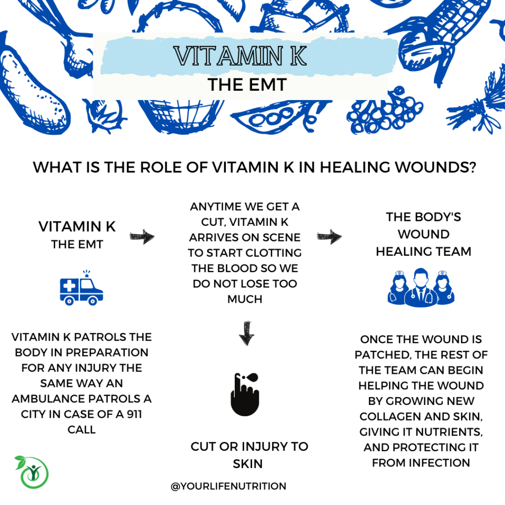 You see, when you get a cut or a scrape the layers of the skin are not intact which allows for the blood to exit its circulation.2 This sounds like a bad thing, but the body is pretty smart.2 As soon as this happens, the ambulance and medical team are sent to the scene. Vitamin K creates a protein called prothrombin that helps the blood to thicken and clump together.2 By doing this, it protects the wound and stops the bleeding so the rest of the team can begin their surgery.3 The platelets help the blood to scab and the fibrin protein creates a net to make sure the clot can’t move out of place.3 Once the outside of the wound is secure, the team works on restoring nutrients and oxygen to the tissue inside which to us looks like inflammation.3 Some other team members include the white blood cells, kind of like the nurse, who guard the wound while it is susceptible to infection and cleans the wound so it stays healthy which is why you may see clear puss washing out the cut as it heals.3 After this, the body needs to grow and build new tissue because the fibrin and clot are only a temporary bandage.3 If you recall, vitamin C helps to make collagen which is the protein that aids this process as the fibrin gets stronger and stronger, eventually restoring the skin.3 This is an incredible process and requires quite a team to get the job done, but none of it would be possible without vitamin K.